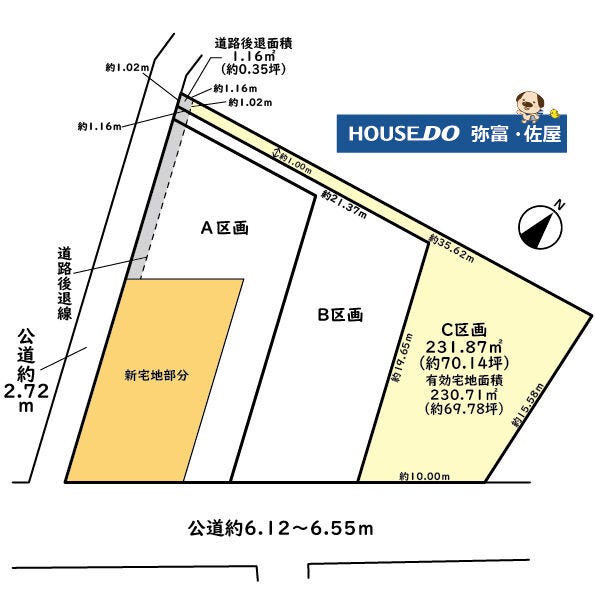 | 土地面積 | 実231.87㎡(70.14坪) | 接道 | 南東側(公道)幅 約6.1m 間口 約10.00m 南西側(公道)幅 約2.7m 間口 約1.02m |